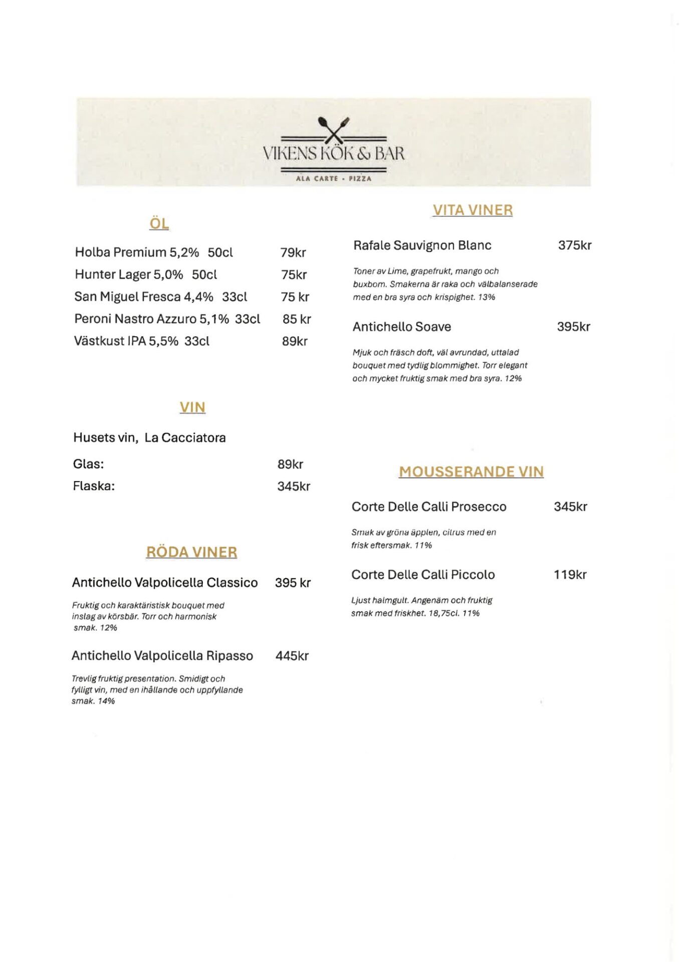 Vikens Kök & Bar är lika mycket en plats att njuta som att umgås. I vår mysiga bar samlas gäster över goda viner, välgjorda drinkar och avslappnat häng – perfekt före middagen, efter maten eller bara för en stunds trevligt sällskap med havet som granne.